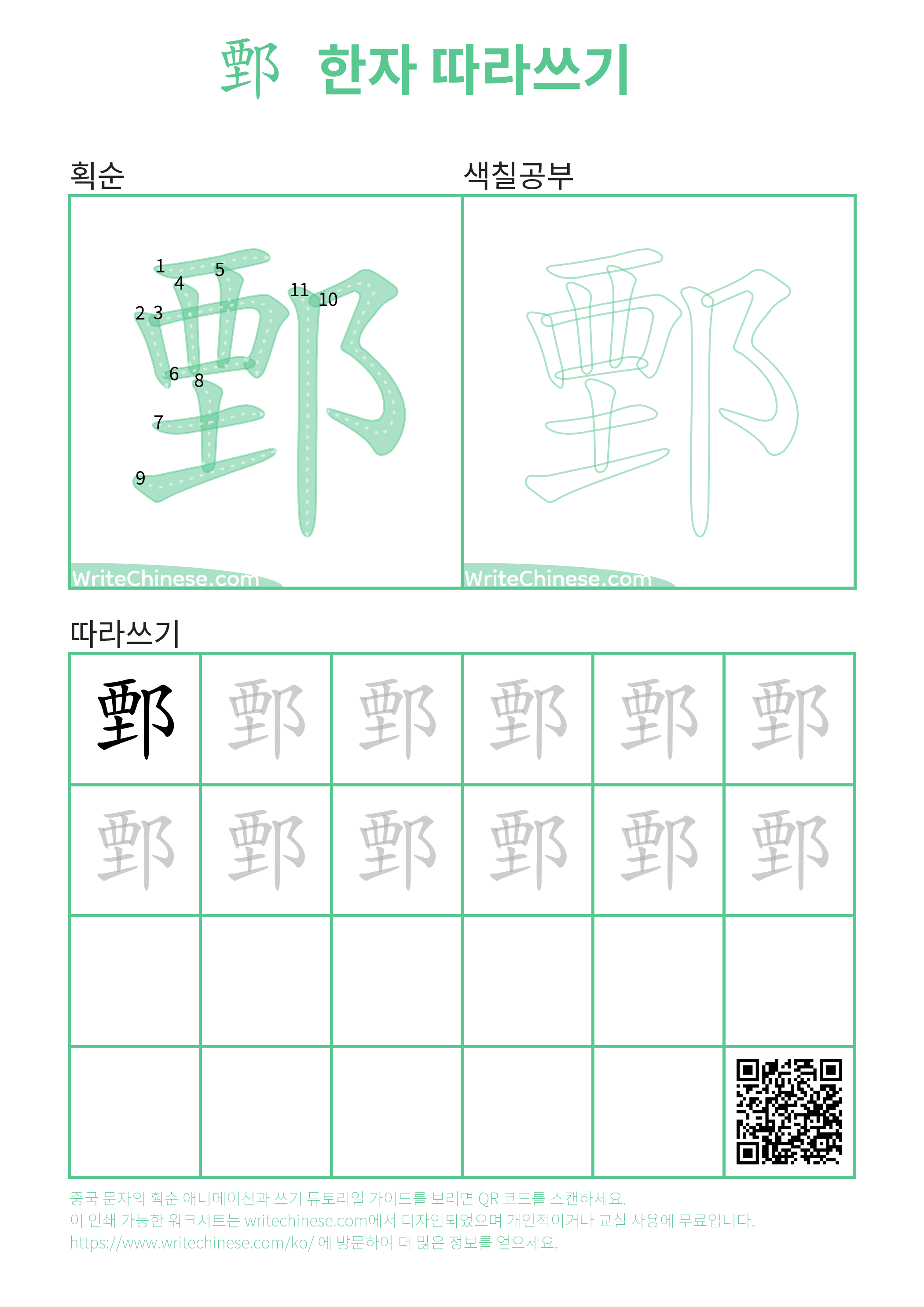 이 웹사이트의 중국어 획순 이미지, 애니메이션, 비디오 및 인쇄 가능한 연습지는 개인 또는 교실에서 무료로 사용할 수 있습니다. 사용할 때 출처와 웹사이트의 URL을 표기해 주세요.