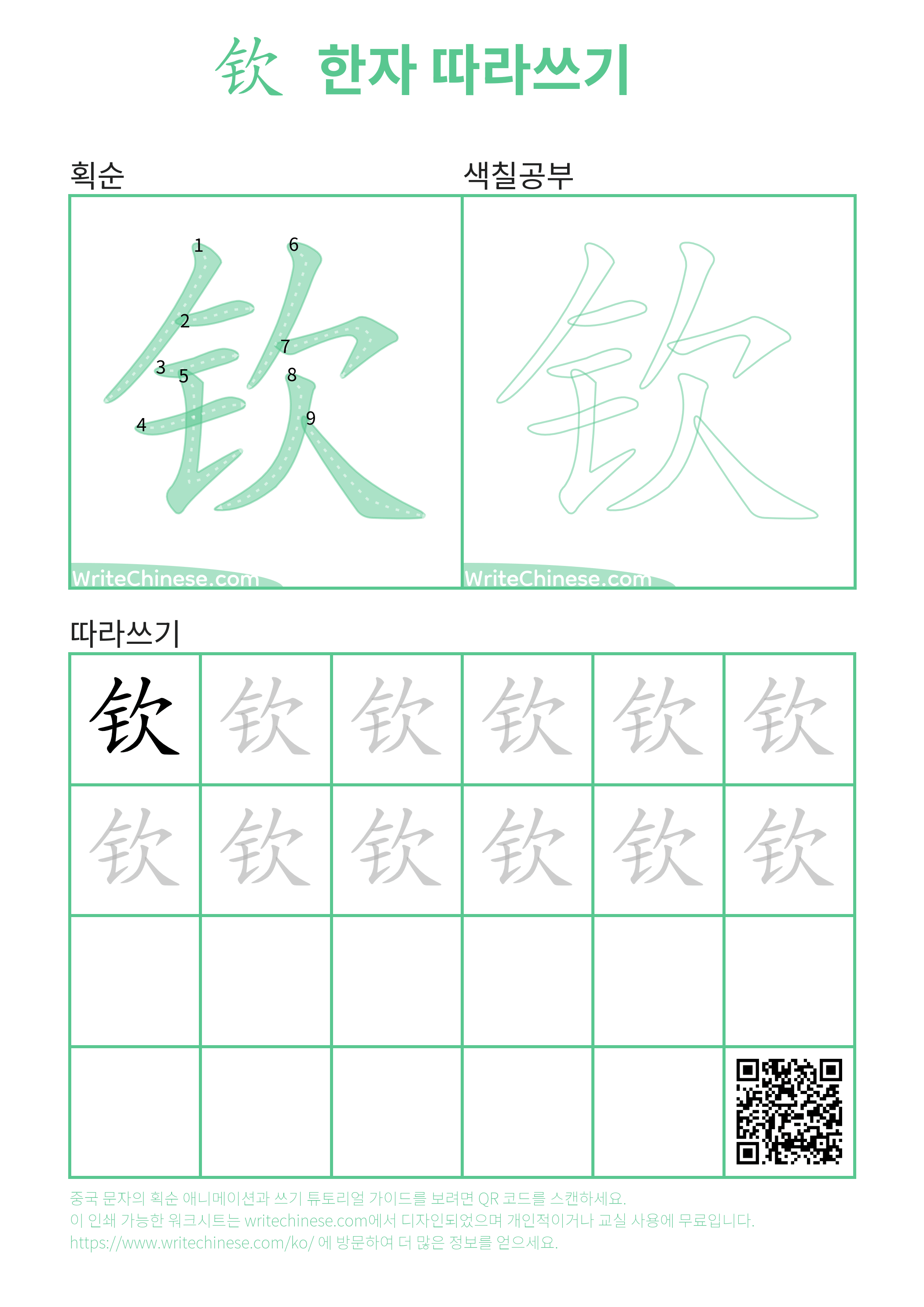 "钦"의 획순 애니메이션을 보면서 중국 문자 "钦"을 쓰는 법을 배워 보세요.