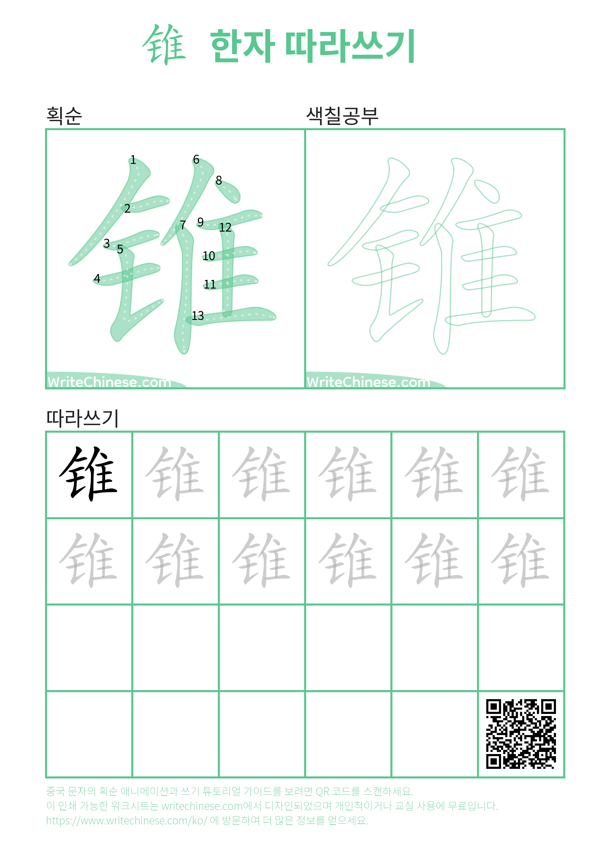 "锥"의 획순 애니메이션을 보면서 중국 문자 "锥"을 쓰는 법을 배워 보세요.