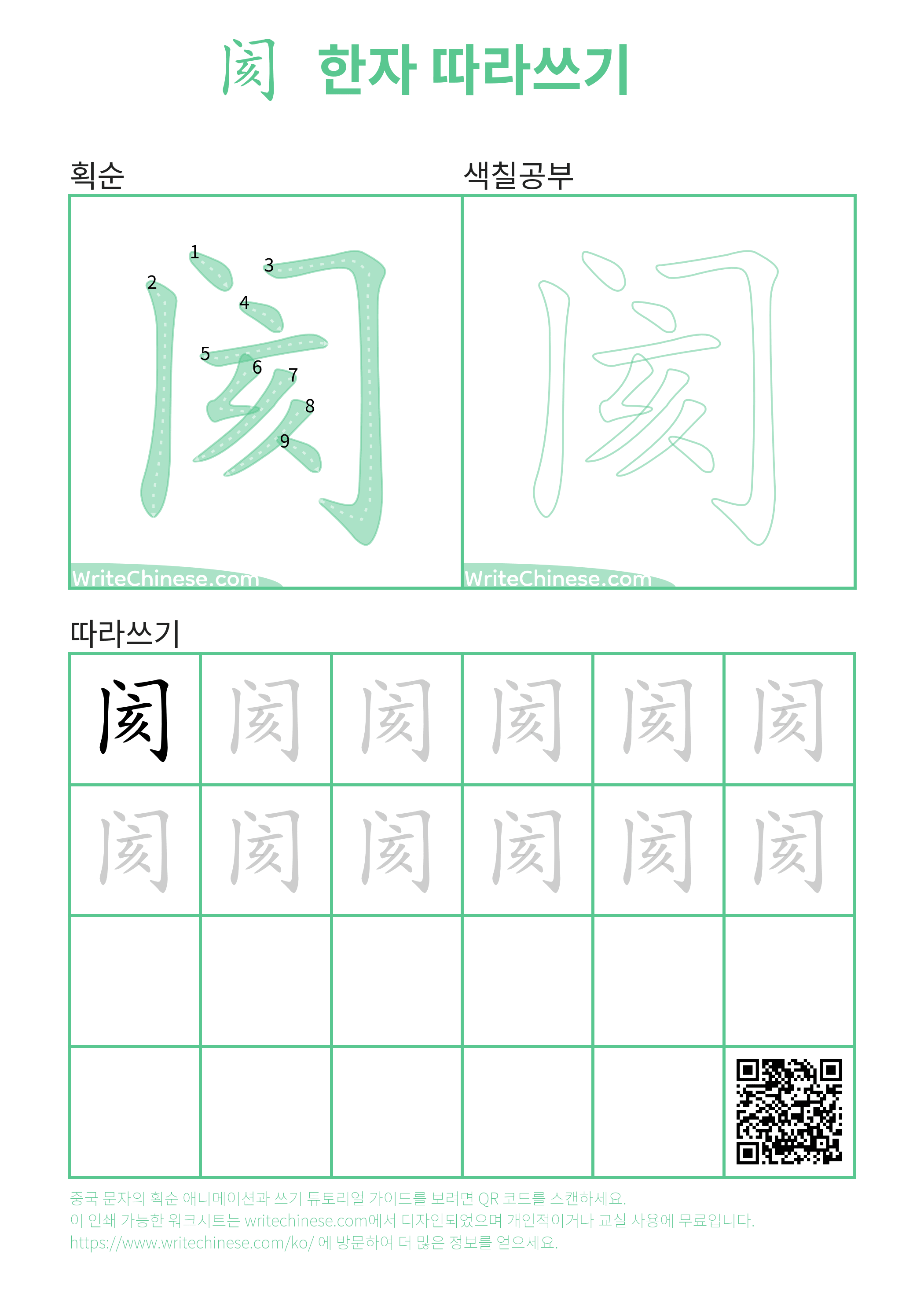 阂의 획순 연습용 인쇄 가능한 연습지입니다