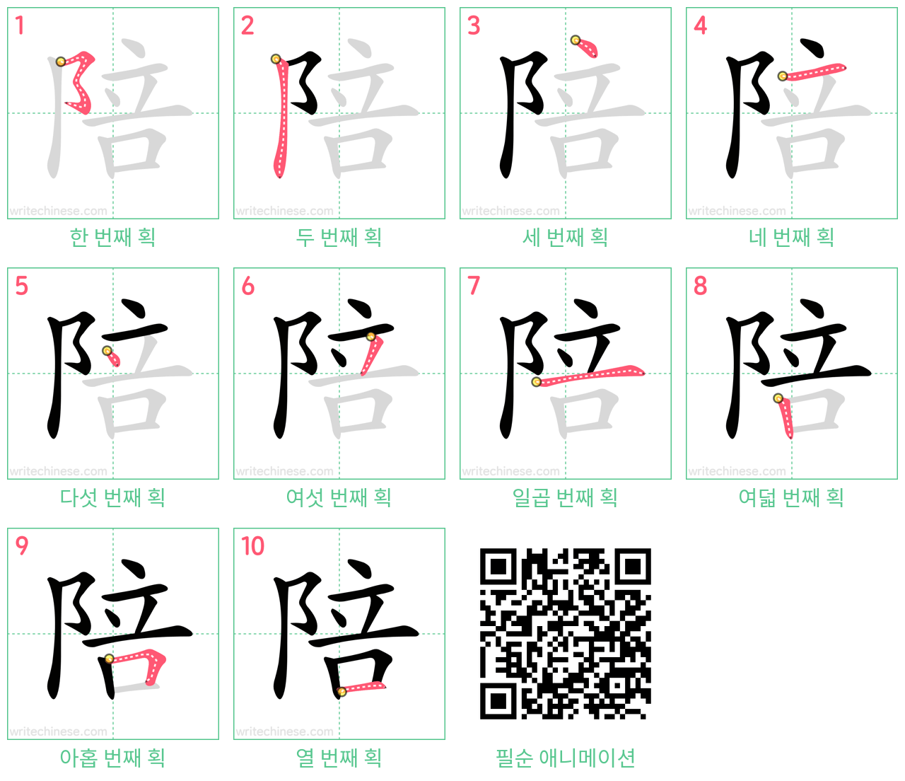"陪"의 획순 애니메이션을 보면서 중국 문자 "陪"을 쓰는 법을 배워 보세요.