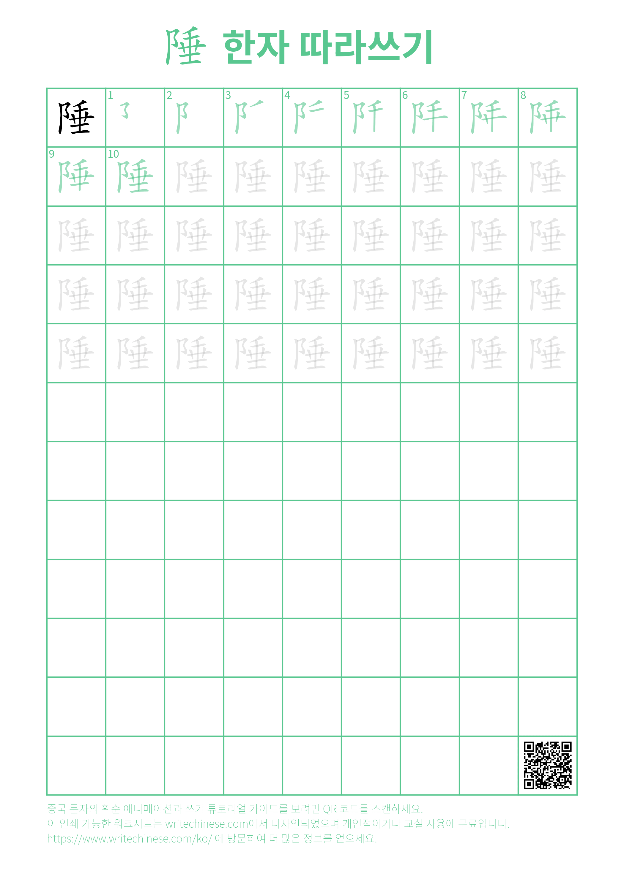 한 획 한 획: 陲의 쓰기 순서. 시각적인 단계별 안내를 통해 중국 문자 '陲'의 획을 하나씩 익혀 보세요.