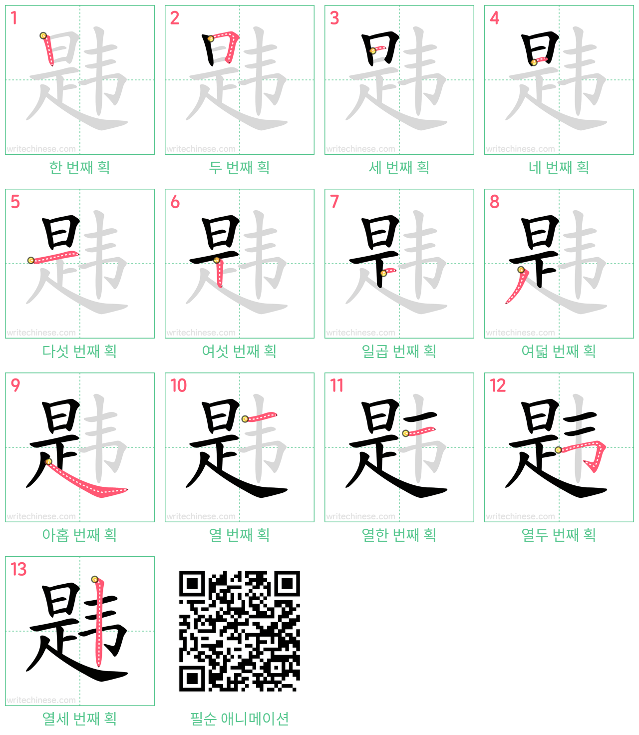 한 획 한 획: 韪의 쓰기 순서. 시각적인 단계별 안내를 통해 중국 문자 '韪'의 획을 하나씩 익혀 보세요.