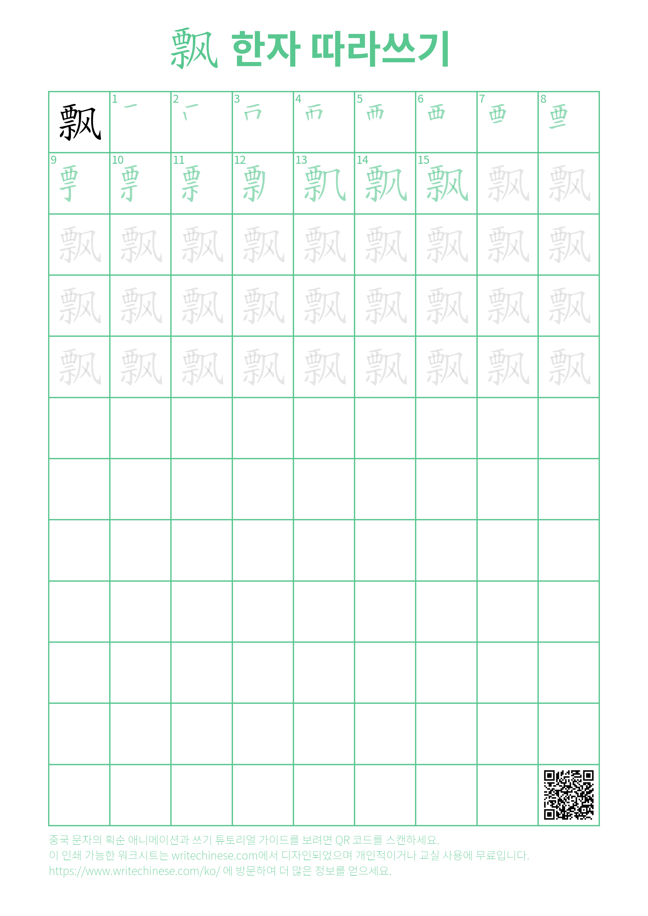 글씨 대가를 따라가며 '飘' 문자를 단계별로 쓰는 방법을 익혀 보세요. 캘리그라피 선생님과 함께하는 비디오 튜토리얼을 통해 중국 문자 '飘'의 올바른 쓰기 방법을 배울 수 있습니다. 아래 링크에서 인쇄용 필기 연습지를 다운로드하여 종이와 펜과 함께 연습해 보세요.