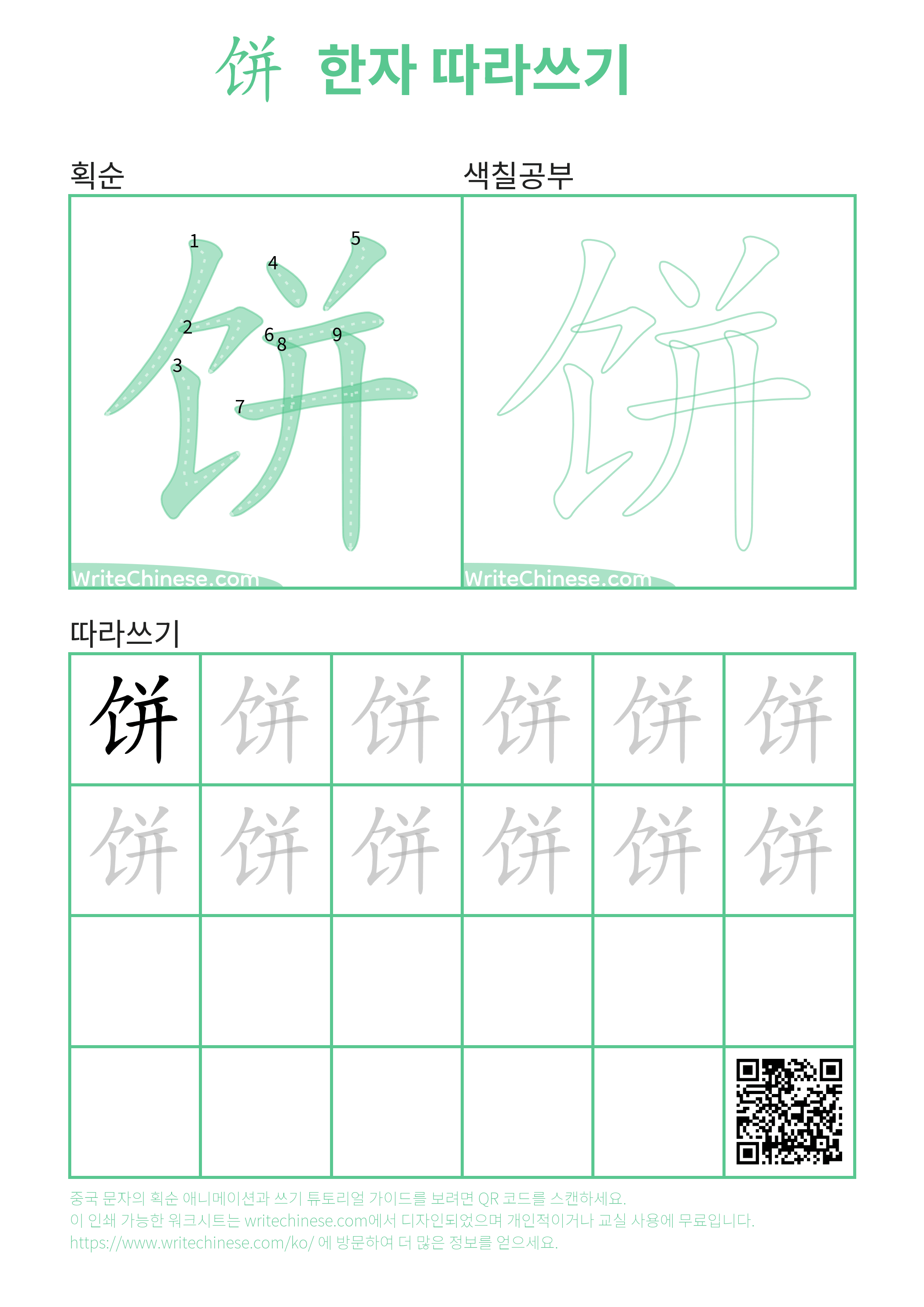 한 획 한 획: 饼의 쓰기 순서. 시각적인 단계별 안내를 통해 중국 문자 '饼'의 획을 하나씩 익혀 보세요.