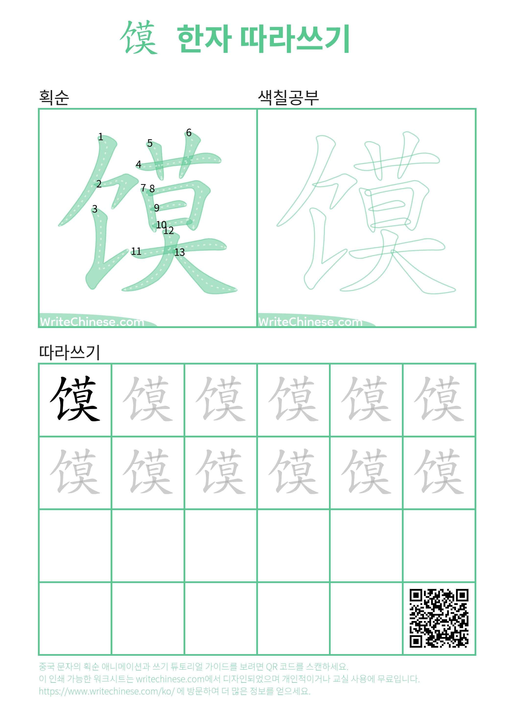 한 획 한 획: 馍의 쓰기 순서. 시각적인 단계별 안내를 통해 중국 문자 '馍'의 획을 하나씩 익혀 보세요.