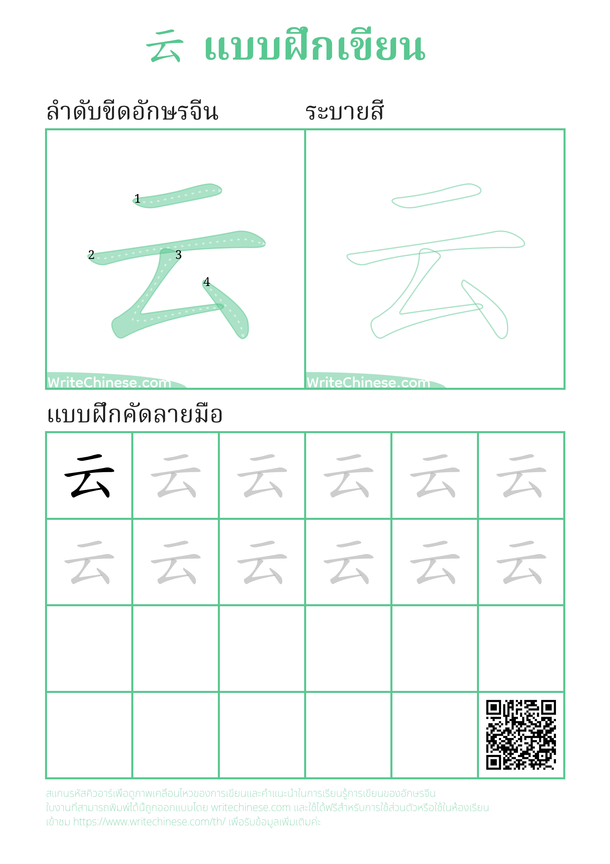 แผ่นงานฝึกฝนลำดับการเขียนตัวอักษรจีน 云 ที่สามารถพิมพ์ได้