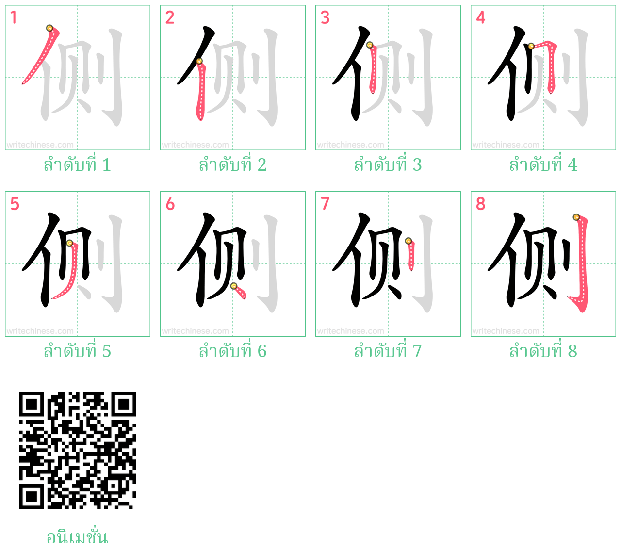 เรียนรู้การเขียนอักษรจีน "侧" โดยการดูภาพเคลื่อนไหวของลำดับการเสียบเส้นของ "侧"
