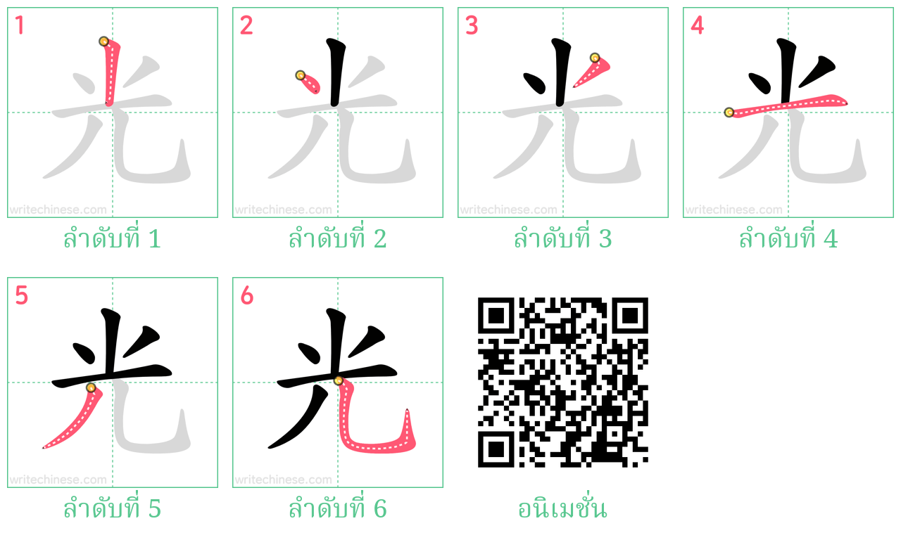 เรียนรู้การเขียนอักษรจีน "光" โดยการดูภาพเคลื่อนไหวของลำดับการเสียบเส้นของ "光"