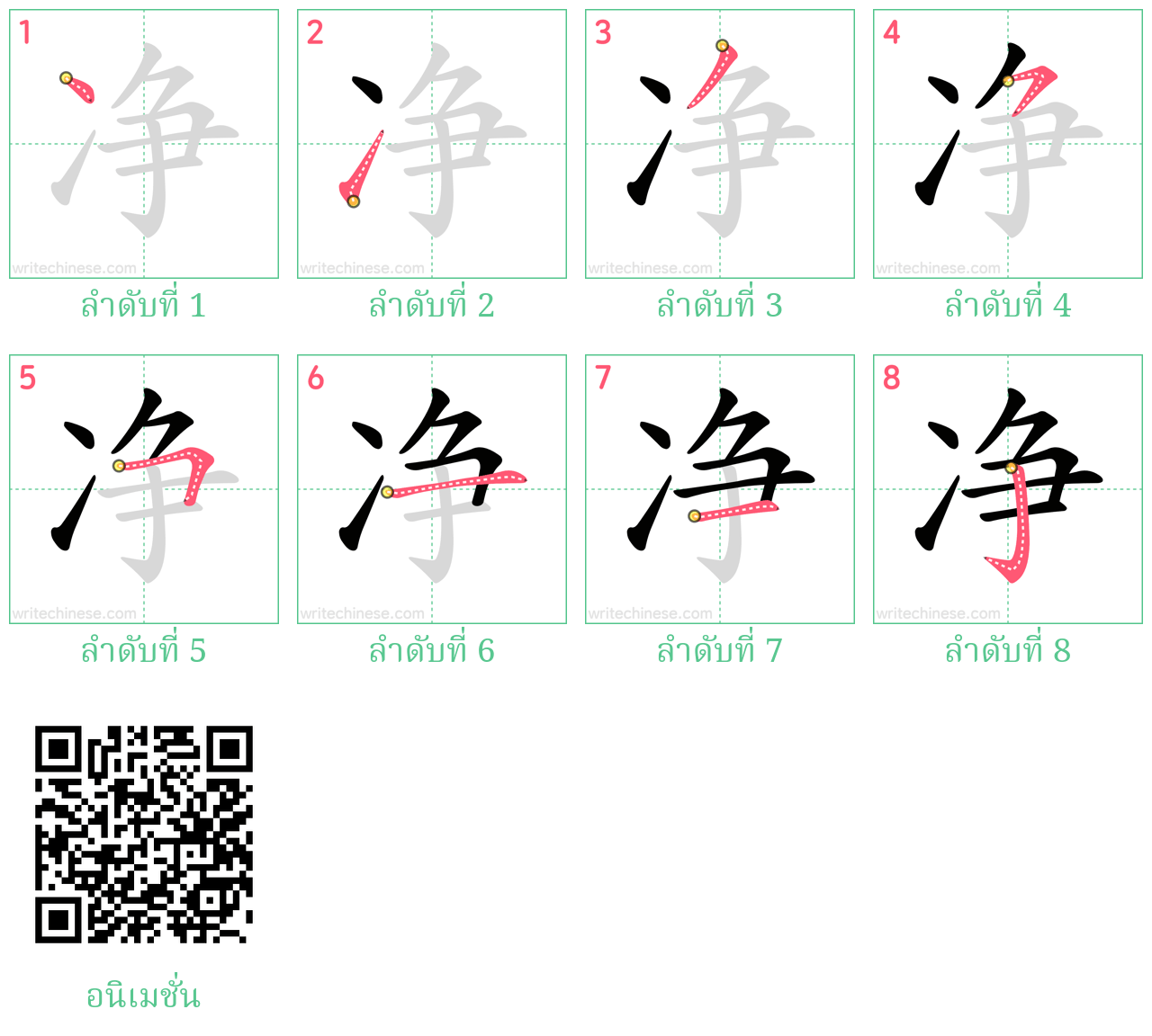 เรียนรู้การเขียนอักษรจีน "净" โดยการดูภาพเคลื่อนไหวของลำดับการเสียบเส้นของ "净"