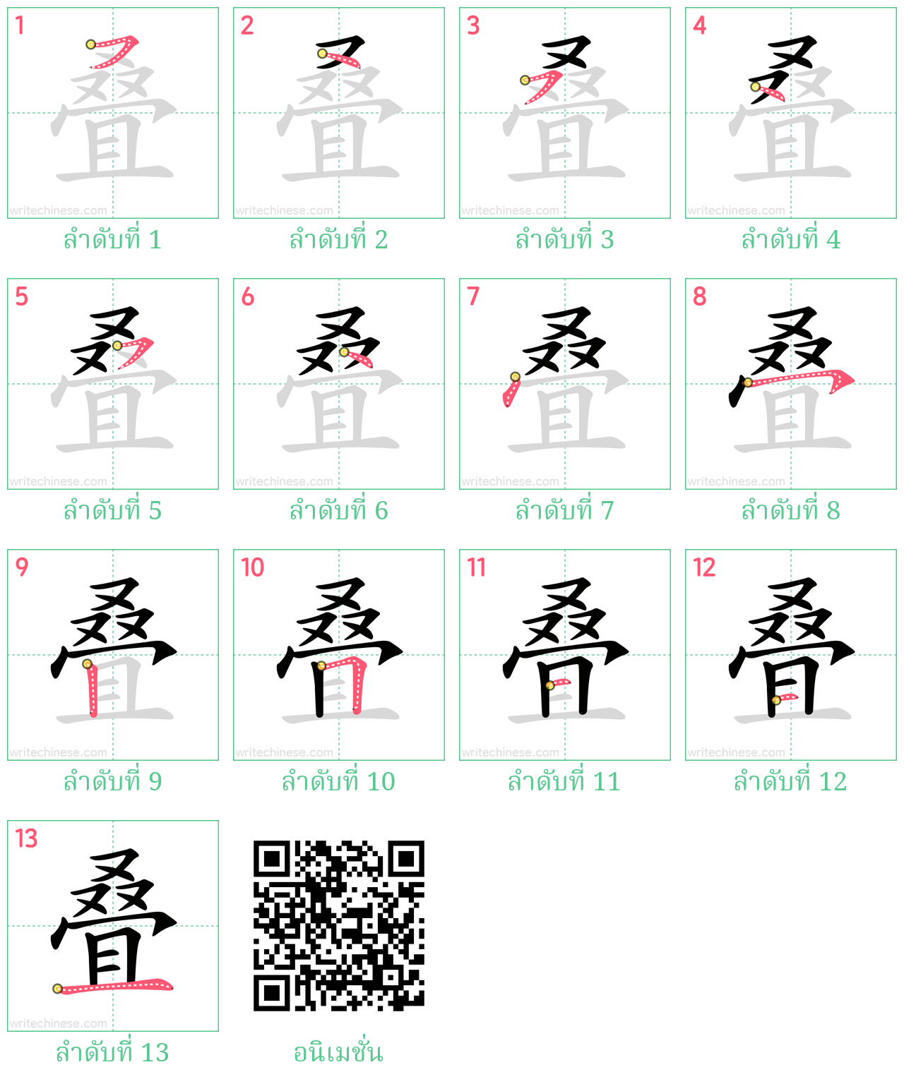 เรียนรู้การเขียนอักษรจีน "叠" ขีดละขีดด้วยคำแนะนำขั้นตอนที่ชัดเจน