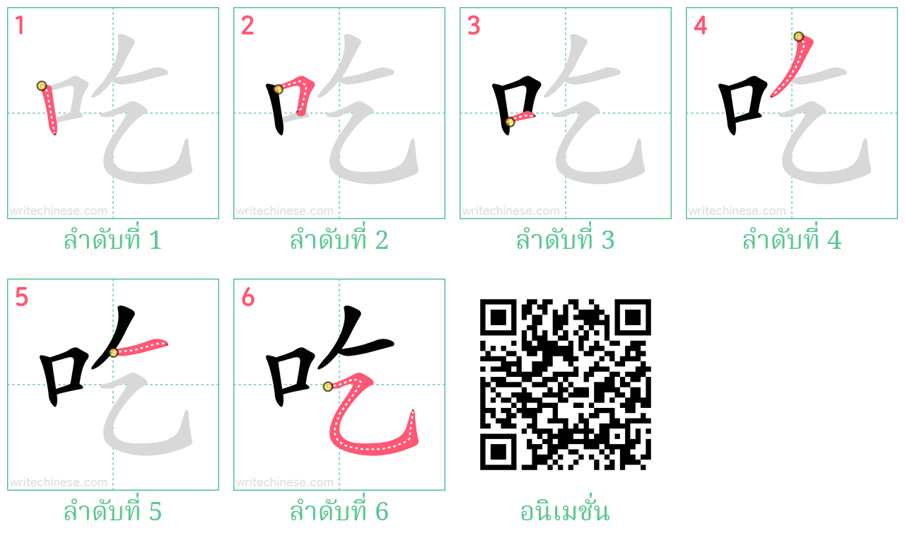 เรียนรู้การเขียนอักษรจีน "吃" โดยการดูภาพเคลื่อนไหวของลำดับการเสียบเส้นของ "吃"