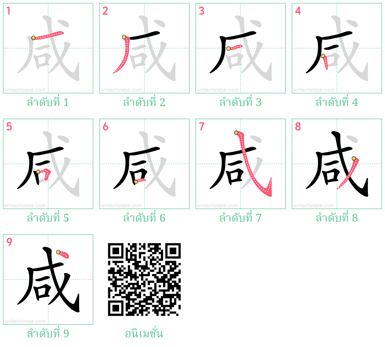 เรียนรู้การเขียนอักษรจีน "咸" โดยการดูภาพเคลื่อนไหวของลำดับการเสียบเส้นของ "咸"