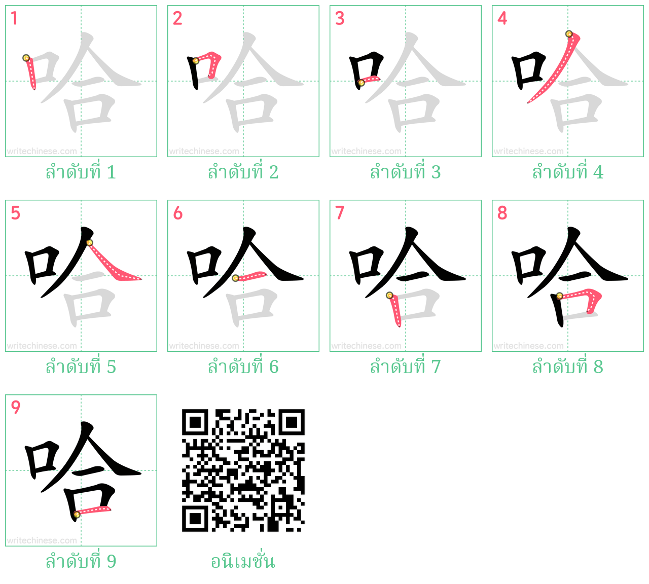 เรียนรู้การเขียนอักษรจีน "哈" โดยการดูภาพเคลื่อนไหวของลำดับการเสียบเส้นของ "哈"