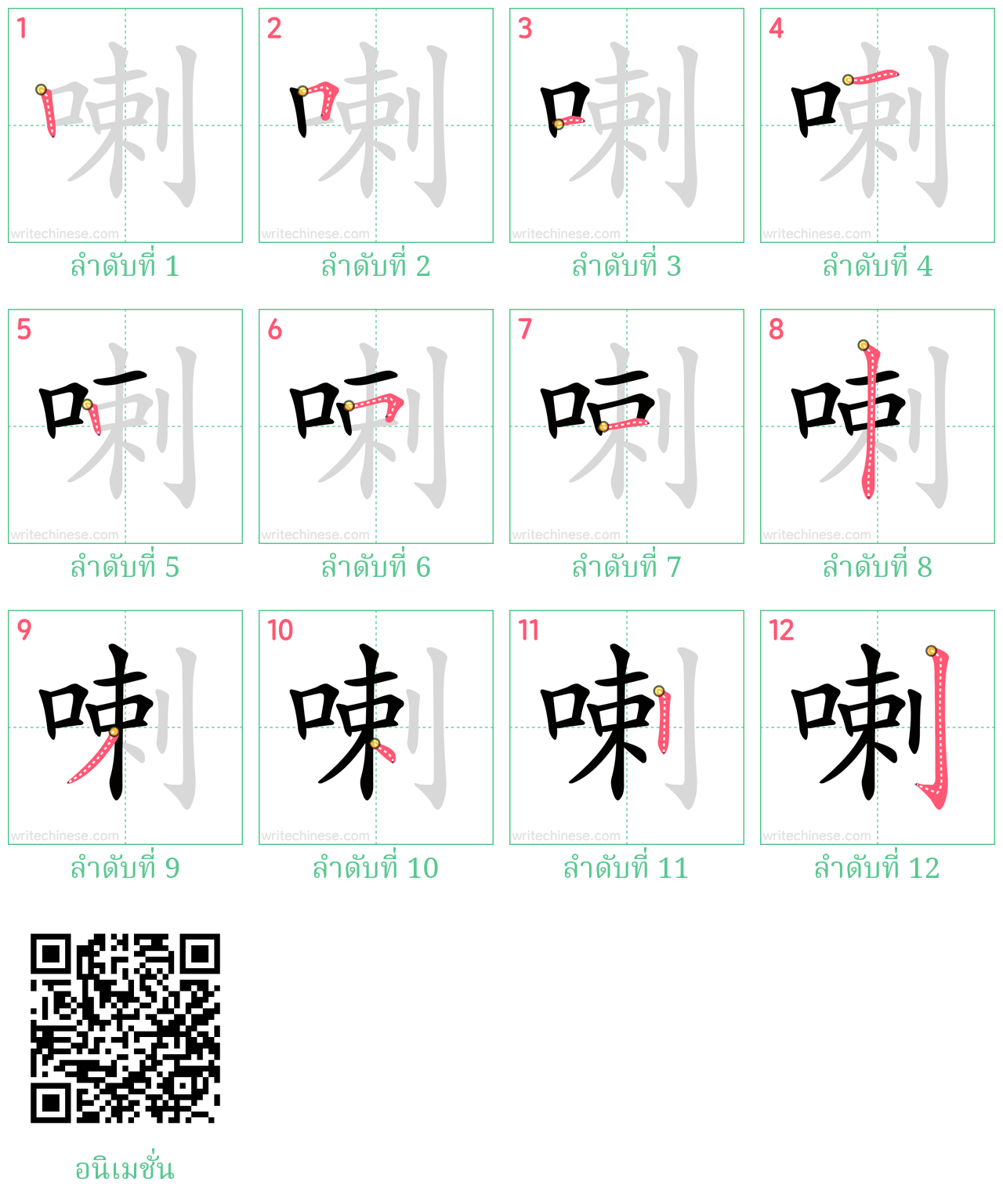 เรียนรู้การเขียนอักษรจีน "喇" โดยการดูภาพเคลื่อนไหวของลำดับการเสียบเส้นของ "喇"
