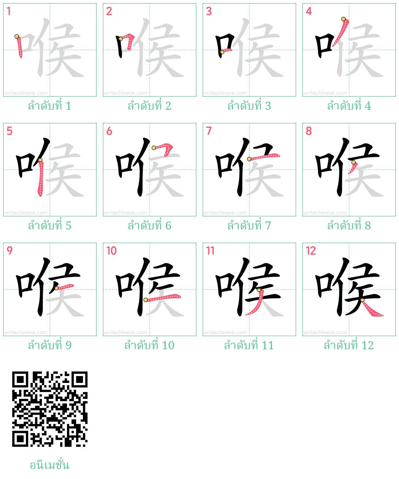 เรียนรู้การเขียนอักษรจีน "喉" โดยการดูภาพเคลื่อนไหวของลำดับการเสียบเส้นของ "喉"