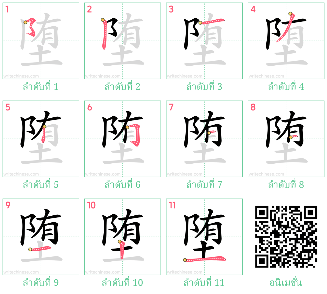 เรียนรู้การเขียนอักษรจีน "堕" ขีดละขีดด้วยคำแนะนำขั้นตอนที่ชัดเจน