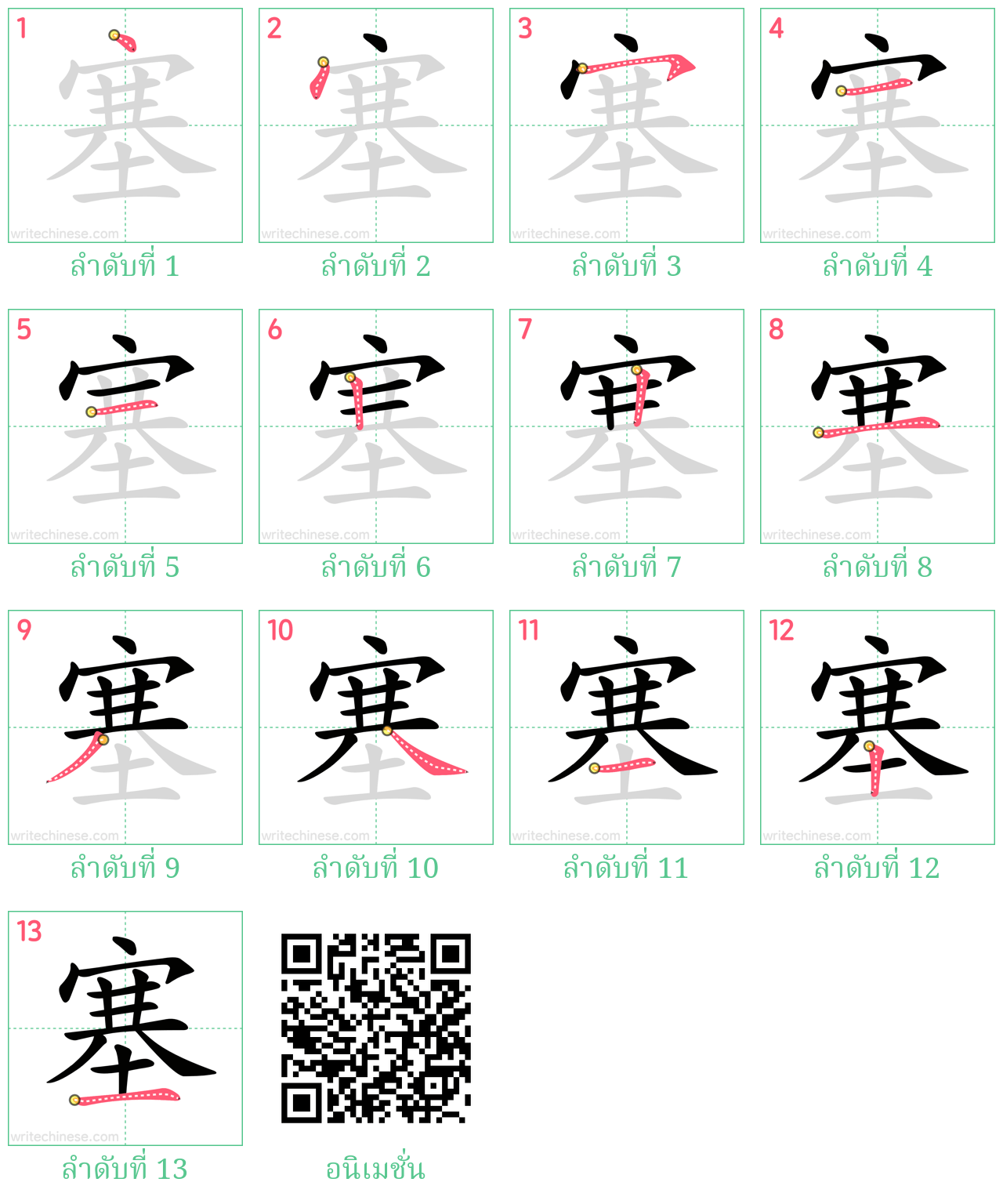 เรียนรู้การเขียนอักษรจีน "塞" โดยการดูภาพเคลื่อนไหวของลำดับการเสียบเส้นของ "塞"