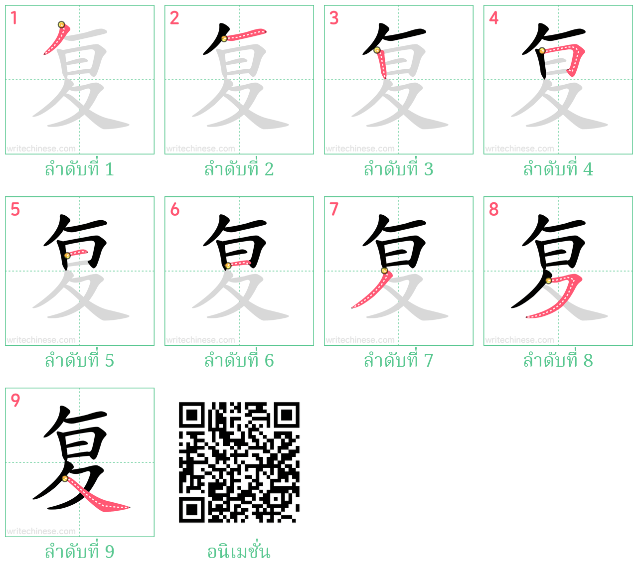 เรียนรู้การเขียนอักษรจีน "复" ขีดละขีดด้วยคำแนะนำขั้นตอนที่ชัดเจน
