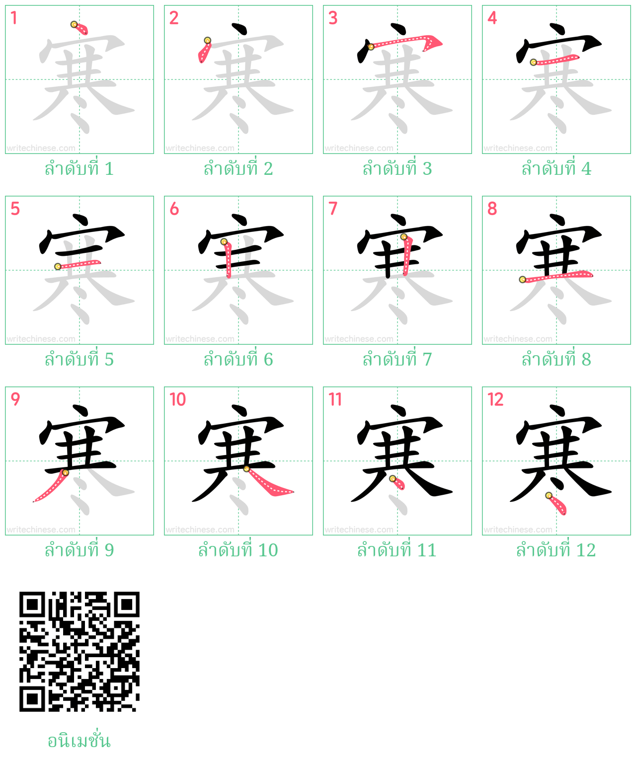 เรียนรู้การเขียนอักษรจีน "寒" โดยการดูภาพเคลื่อนไหวของลำดับการเสียบเส้นของ "寒"