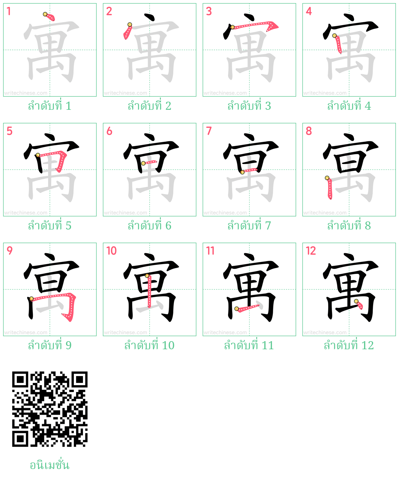 เรียนรู้การเขียนอักษรจีน "寓" โดยการดูภาพเคลื่อนไหวของลำดับการเสียบเส้นของ "寓"