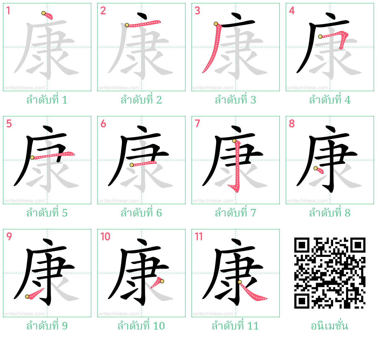 เรียนรู้การเขียนอักษรจีน "康" โดยการดูภาพเคลื่อนไหวของลำดับการเสียบเส้นของ "康"