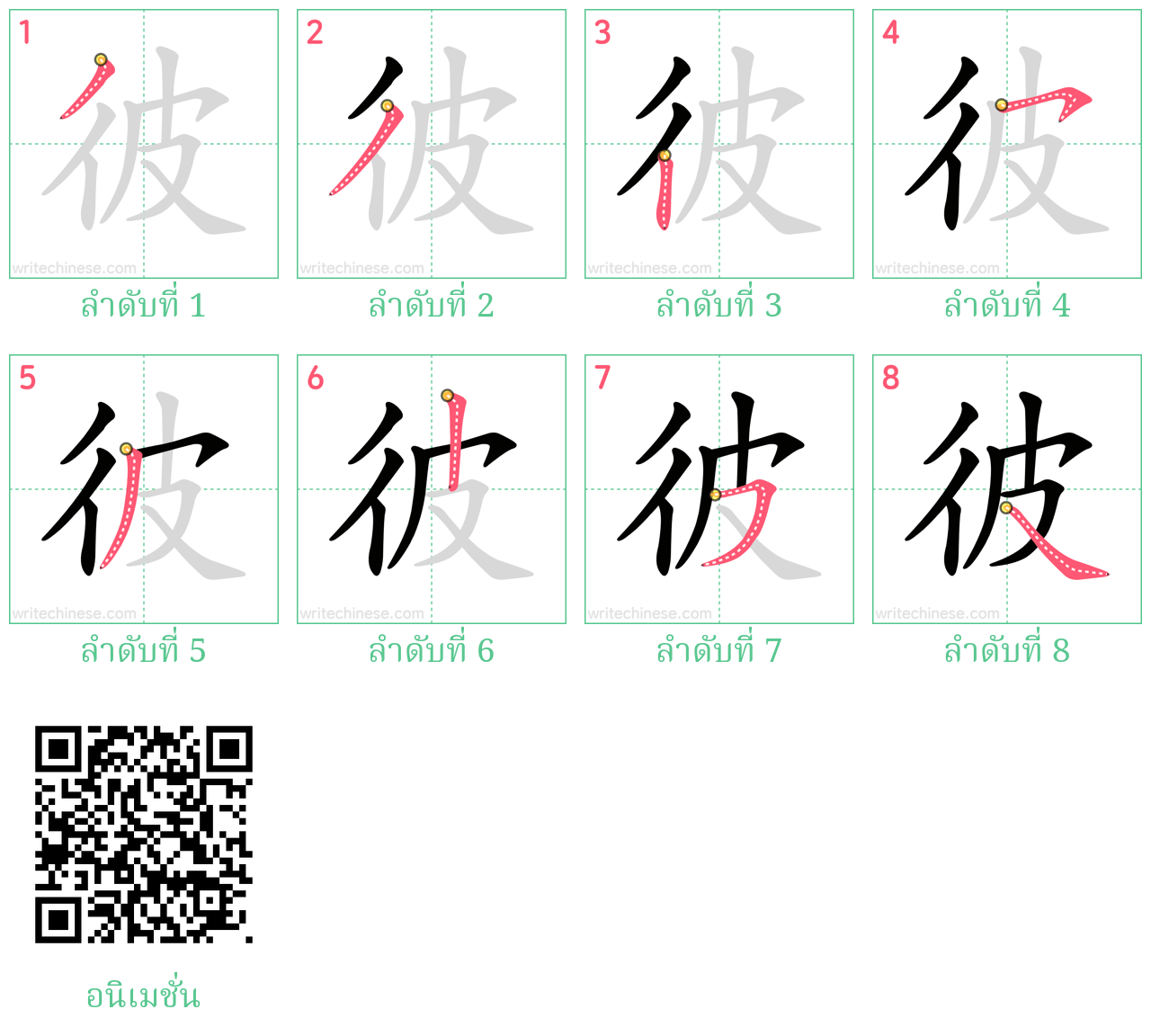 เรียนรู้การเขียนอักษรจีน "彼" โดยการดูภาพเคลื่อนไหวของลำดับการเสียบเส้นของ "彼"