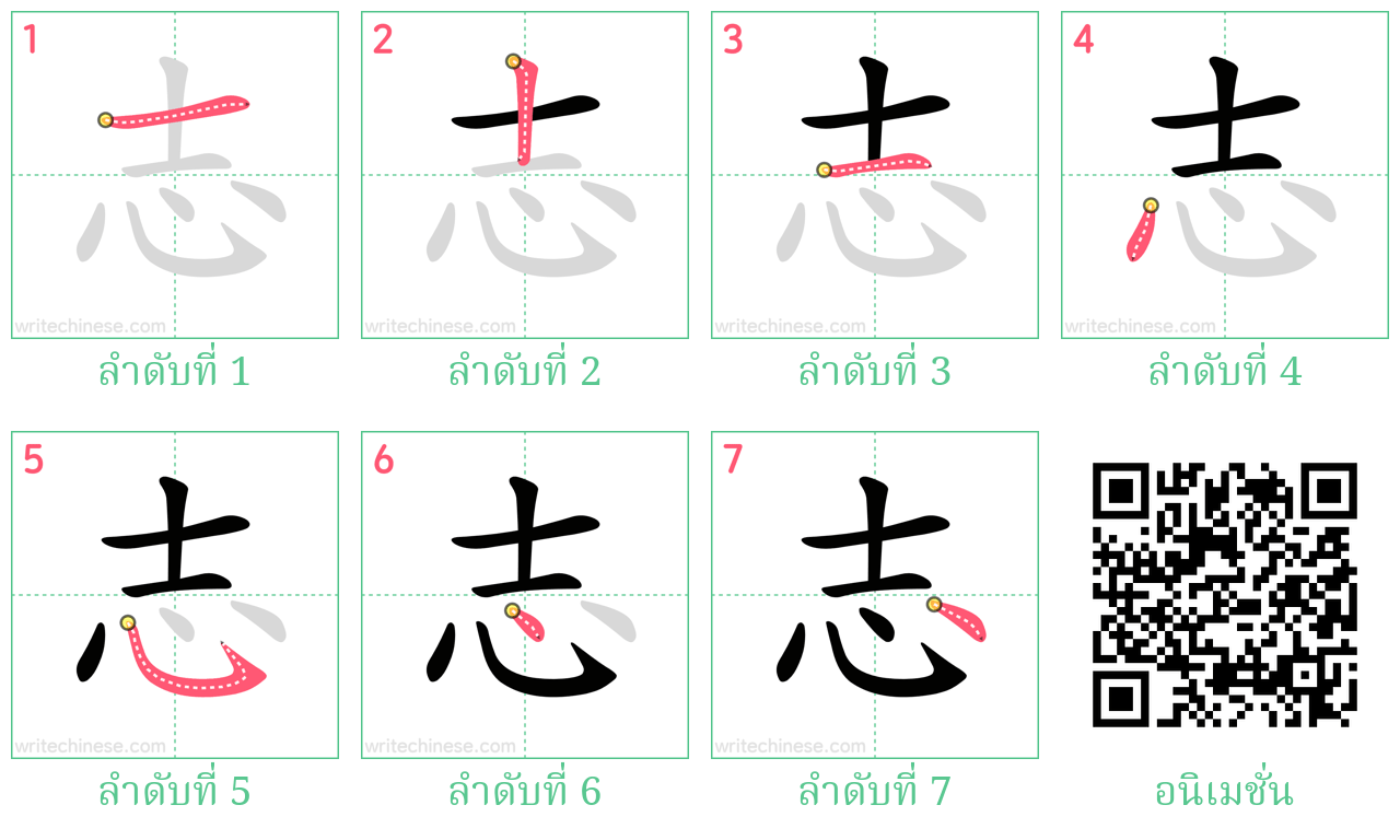 เรียนรู้การเขียนอักษรจีน "志" โดยการดูภาพเคลื่อนไหวของลำดับการเสียบเส้นของ "志"