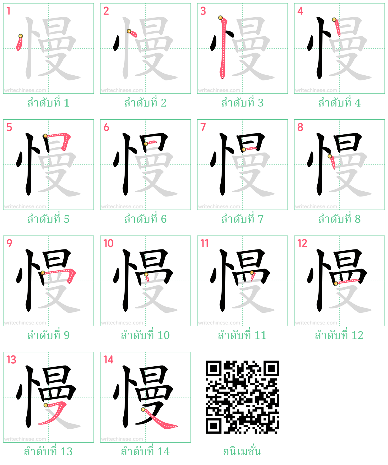 慢 [màn] (动) 【本义】:轻慢;对人无礼貌 1 迟缓,速度小,与“快”相对:~车。~件。~腾腾。~条斯理。缓~。迟~。~性。 การชะลอ ความเร็วช้า ตรงข้ามกับ “เร็ว”: ~รถ ~สิ่งของ ~ช้าๆ ~อย่างมีระเบียบ ~เบาๆ ~ช้า ~ลักษณะช้า 2 态度冷淡,不殷勤,不礼貌:~待。轻~。傲~。怠~。 ท่าทางเย็นชา ไม่มีความเอื้อเฟื้อ ไม่สุภาพ: ~การต้อนรับ ~การเบา ~การหยิ่ง ~การมองข้าม 慢 [màn] (形) 1 懒惰 ขี้เกียจ 2 不及时,迟了 ไม่ทันเวลา ช้า 3 从慢走引申为缓慢 จากการเดินช้าไปสู่ความช้า 4 骄傲;傲慢 หยิ่ง;ดูถูก 5 生疏 ไม่คุ้นเคย 6 丰满 อ้วนใหญ่ 慢 [màn] (副) 徒然 เปล่าประโยชน์ 慢 [màn] (动) 1 同本义 ความหมายเดียวกัน 2 怠慢 การมองข้าม 3 放纵;无节制 การตามใจ;ไร้ระเบียบ 4 通“谩”。欺骗 หมายถึง “กัด” หลอกลวง 5 通“墁”。涂抹 หมายถึง “ปู” กดทับ 慢 [màn] (形) 1 懒惰 ขี้เกียจ 2 不及时,迟了 ไม่ทันเวลา ช้า 3 从慢走引申为缓慢 จากการเดินช้าไปสู่ความช้า 4 骄傲;傲慢 หยิ่ง;ดูถูก 5 生疏 ไม่คุ้นเคย 6 丰满 อ้วนใหญ่ 慢 [màn] (副) 徒然 เปล่าประโยชน์