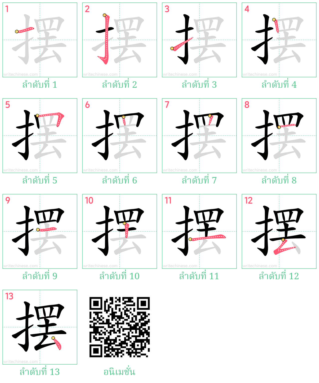 เรียนรู้การเขียนอักษรจีน "摆" ขีดละขีดด้วยคำแนะนำขั้นตอนที่ชัดเจน