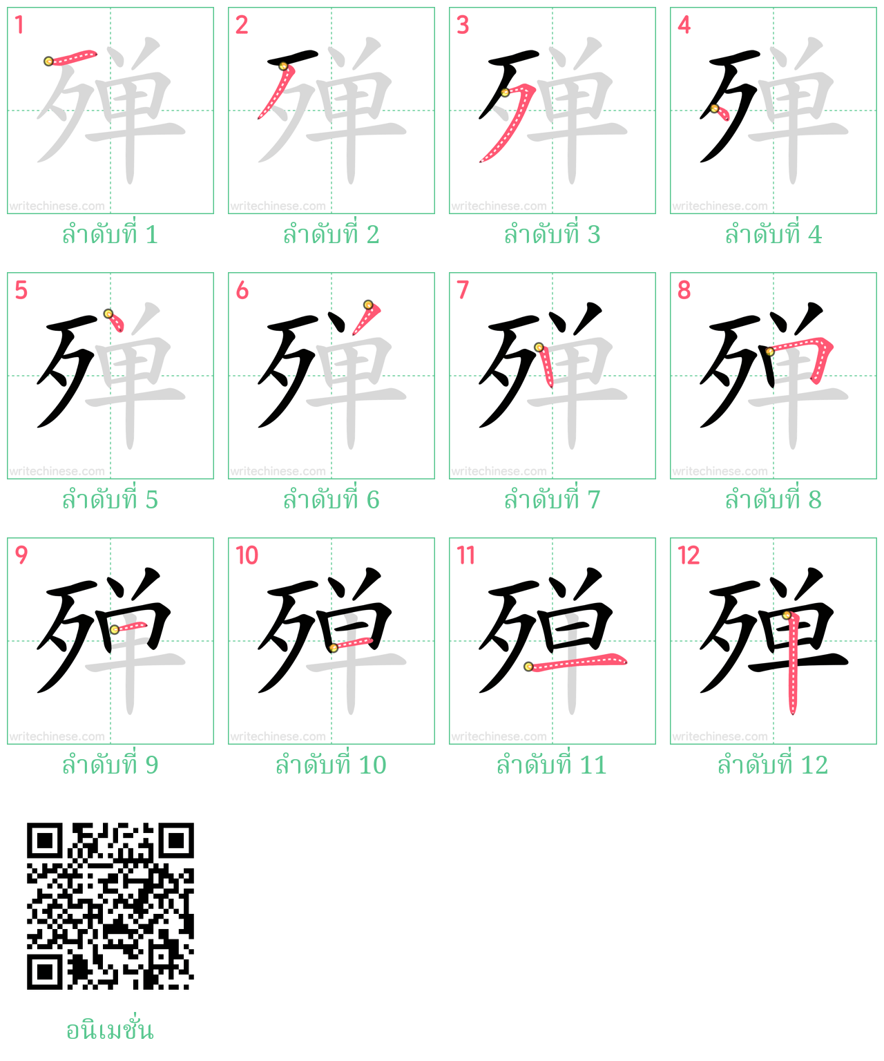 แผ่นงานฝึกฝนลำดับการเขียนตัวอักษรจีน 殚 ที่สามารถพิมพ์ได้