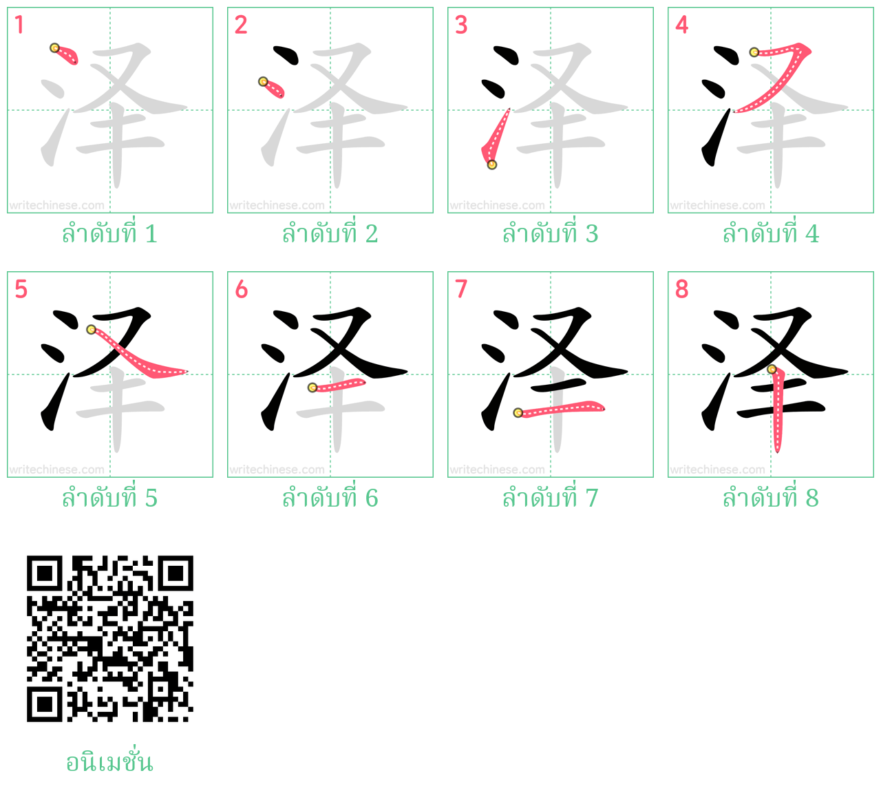 เรียนรู้การเขียนอักษรจีน "泽" โดยการดูภาพเคลื่อนไหวของลำดับการเสียบเส้นของ "泽"
