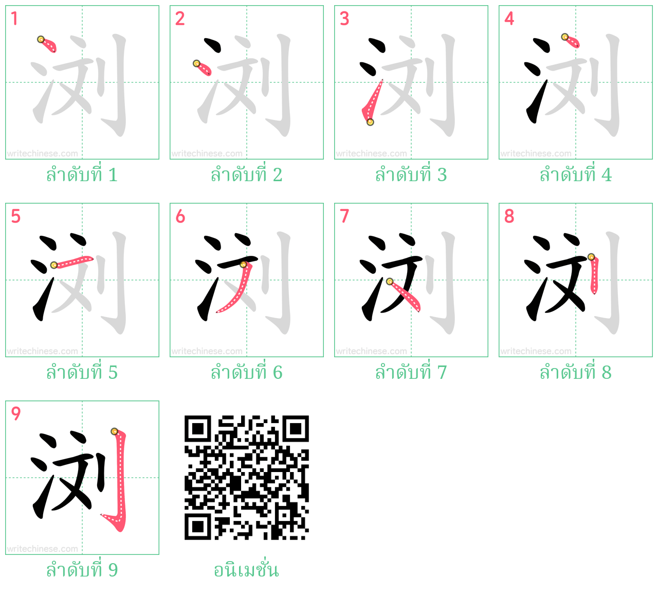 เรียนรู้การเขียนอักษรจีน "浏" โดยการดูภาพเคลื่อนไหวของลำดับการเสียบเส้นของ "浏"