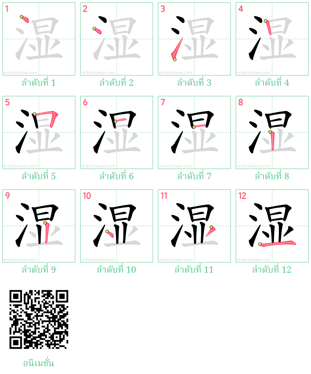 เรียนรู้การเขียนอักษรจีน "湿" โดยการดูภาพเคลื่อนไหวของลำดับการเสียบเส้นของ "湿"