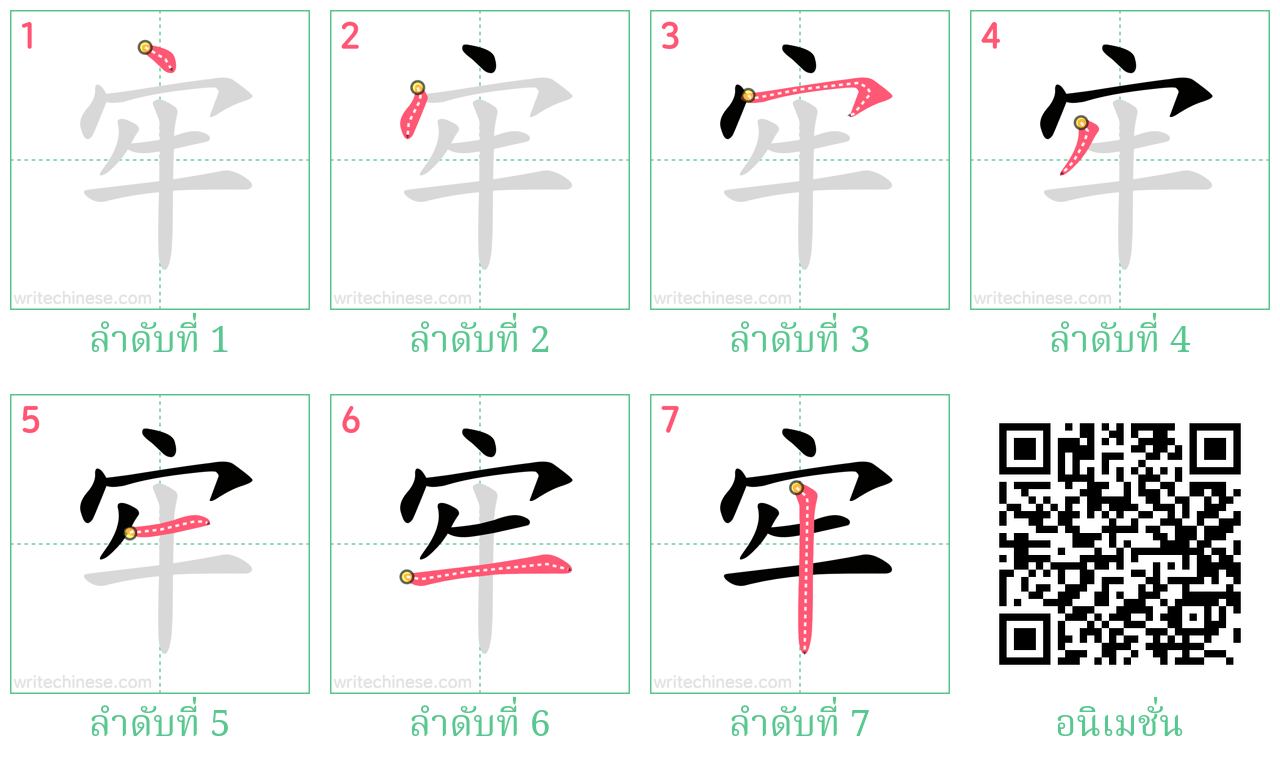 เรียนรู้การเขียนอักษรจีน "牢" โดยการดูภาพเคลื่อนไหวของลำดับการเสียบเส้นของ "牢"