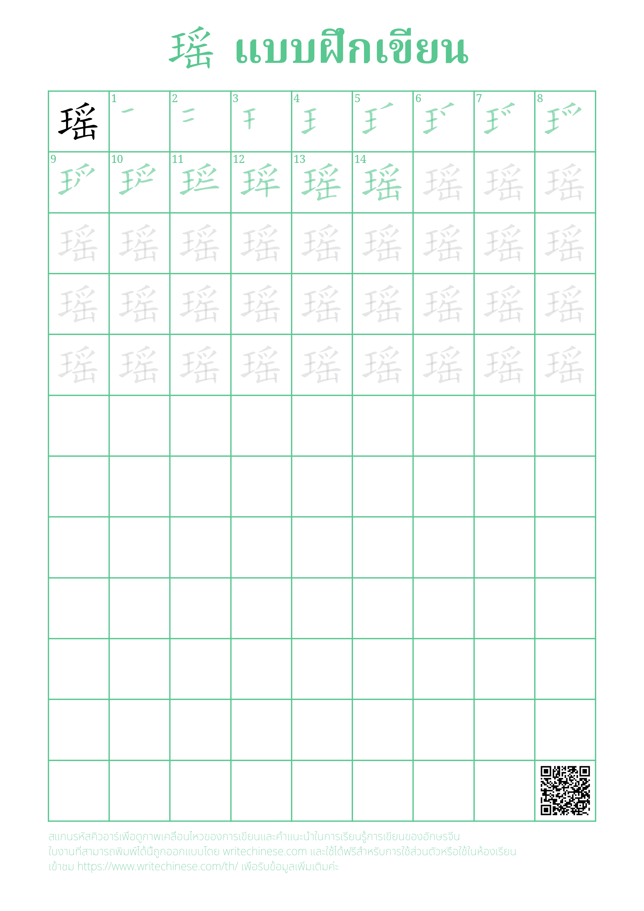 แผ่นงานฝึกฝนลำดับการเขียนตัวอักษรจีน 瑶 ที่สามารถพิมพ์ได้