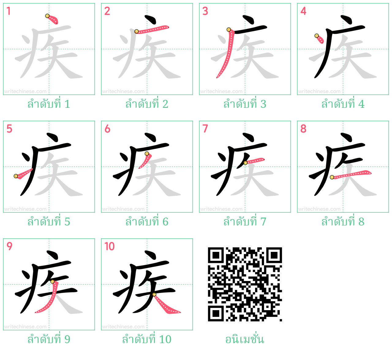 เรียนรู้การเขียนอักษรจีน "疾" ขีดละขีดด้วยคำแนะนำขั้นตอนที่ชัดเจน