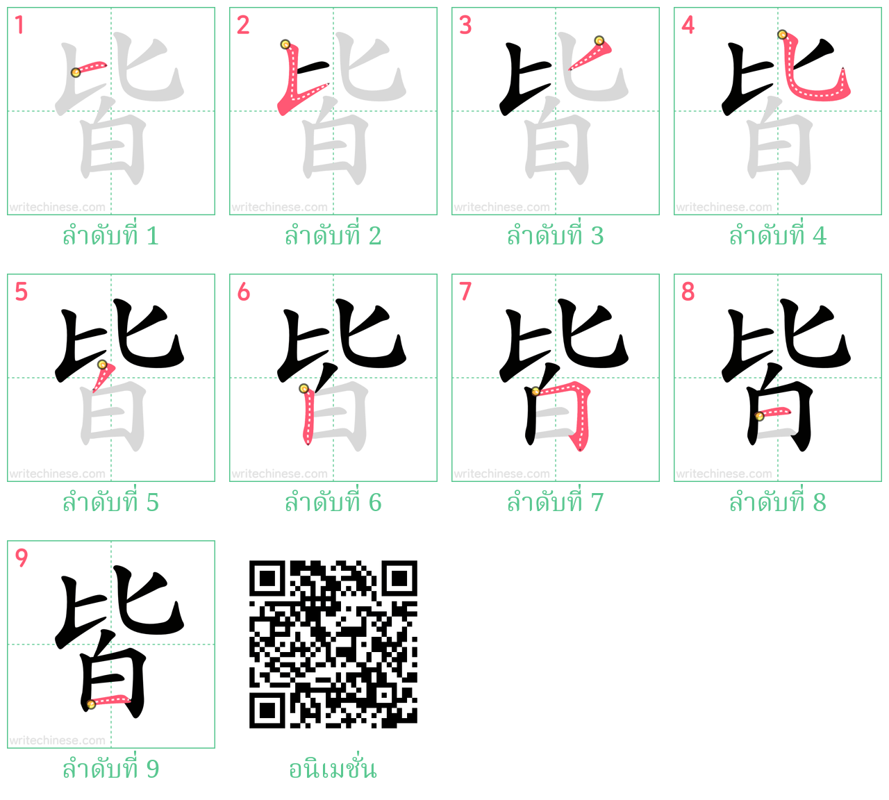 เรียนรู้การเขียนอักษรจีน "皆" โดยการดูภาพเคลื่อนไหวของลำดับการเสียบเส้นของ "皆"