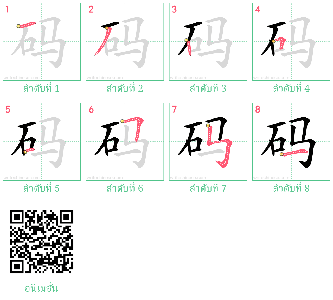 码 碼 mǎ 1 代表数目的符号。 * หมายถึงสัญลักษณ์ที่เป็นตัวแทนของจำนวน 2 计算数量的用具。 * อุปกรณ์ที่ใช้ในการคำนวณจำนวน 3 指一件事或一类的事。 * หมายถึงเรื่องหนึ่งหรือกลุ่มของเรื่องต่างๆ 4 英美制长度单位,一码等于0.9144米。 * หน่วยความยาวในระบบอังกฤษและอเมริกา หนึ่งหลา (yard) เท่ากับ 0.9144 เมตร 5 堆叠。 * การซ้อนกัน 6 古同“ 玛 ”,玛瑙(亦作“码碯”)。 * ในสมัยโบราณเดียวกับ “ม่า” คือหินชนิดหนึ่งที่เรียกว่า อาเกต (agate)