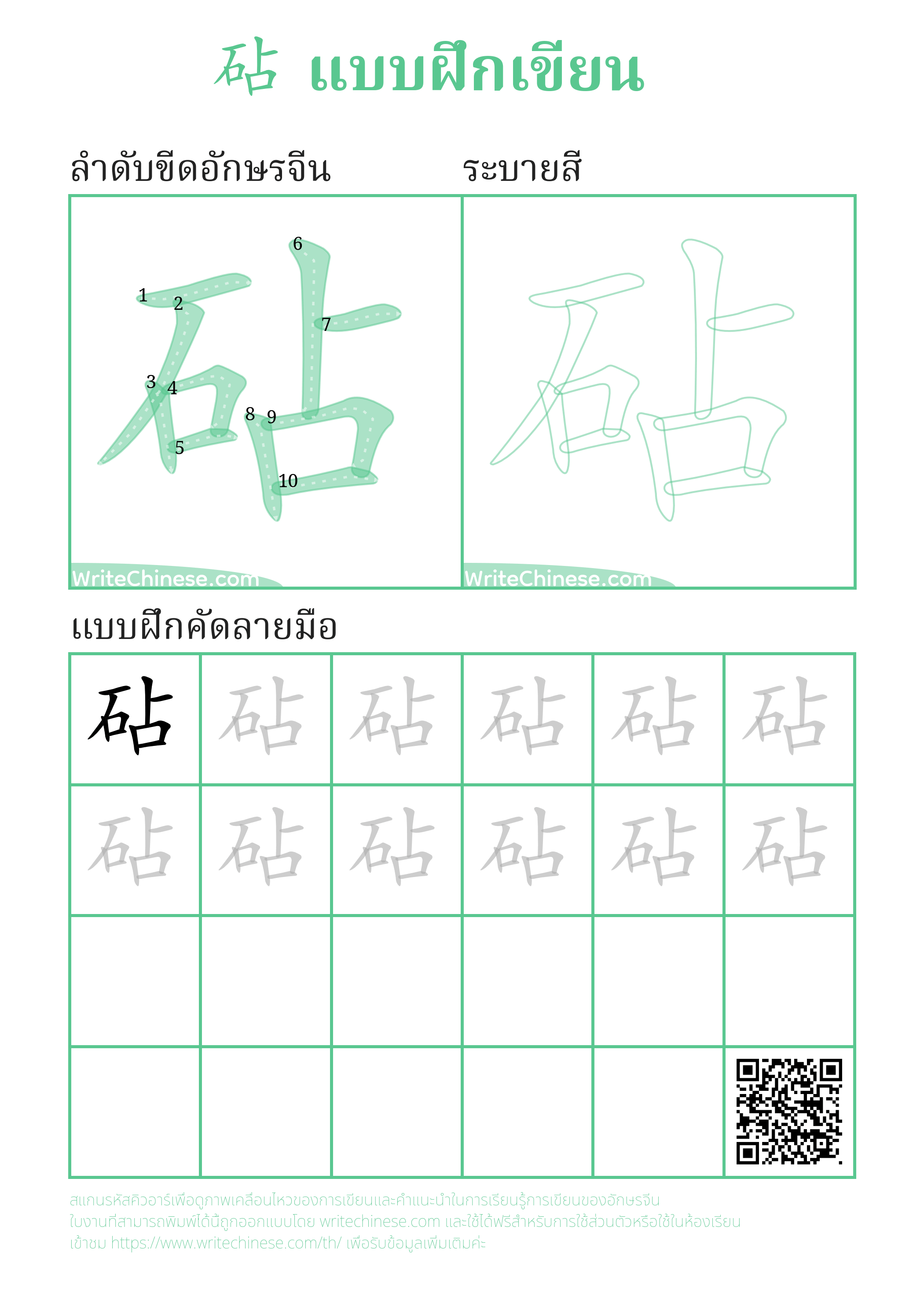 แผ่นงานฝึกฝนลำดับการเขียนตัวอักษรจีน 砧 ที่สามารถพิมพ์ได้