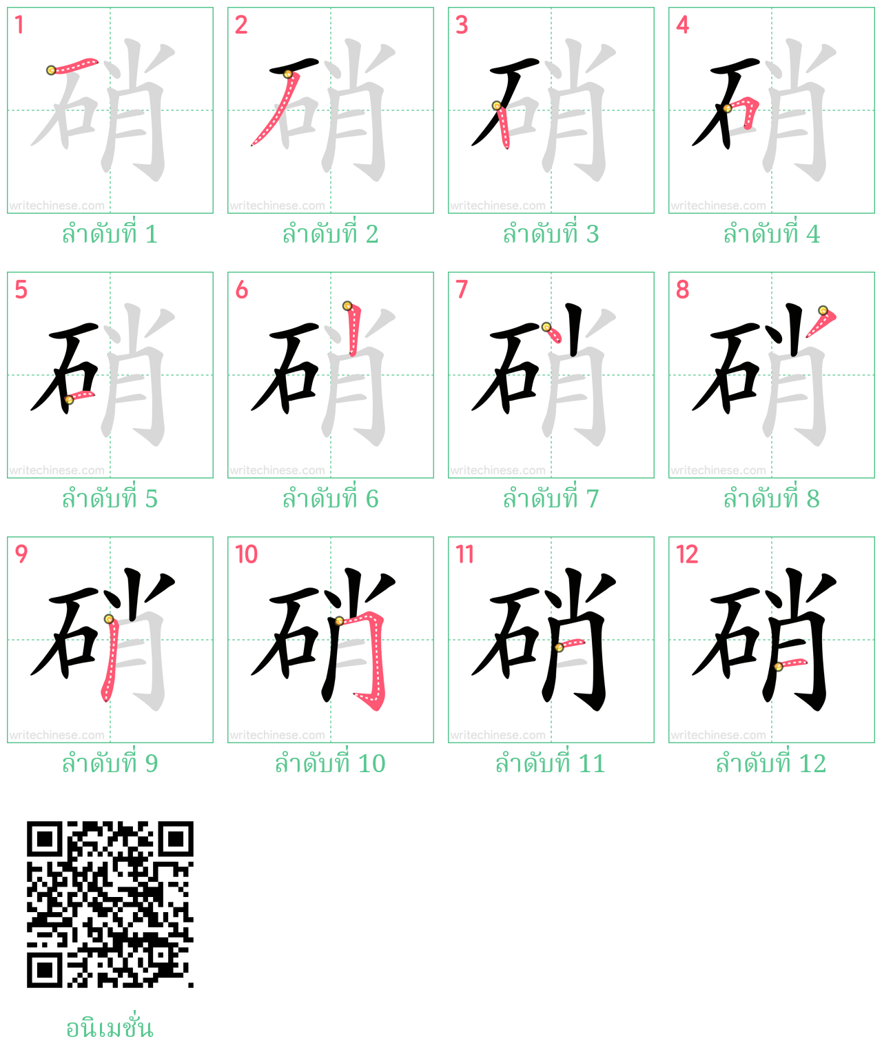 เรียนรู้การเขียนอักษรจีน "硝" โดยการดูภาพเคลื่อนไหวของลำดับการเสียบเส้นของ "硝"