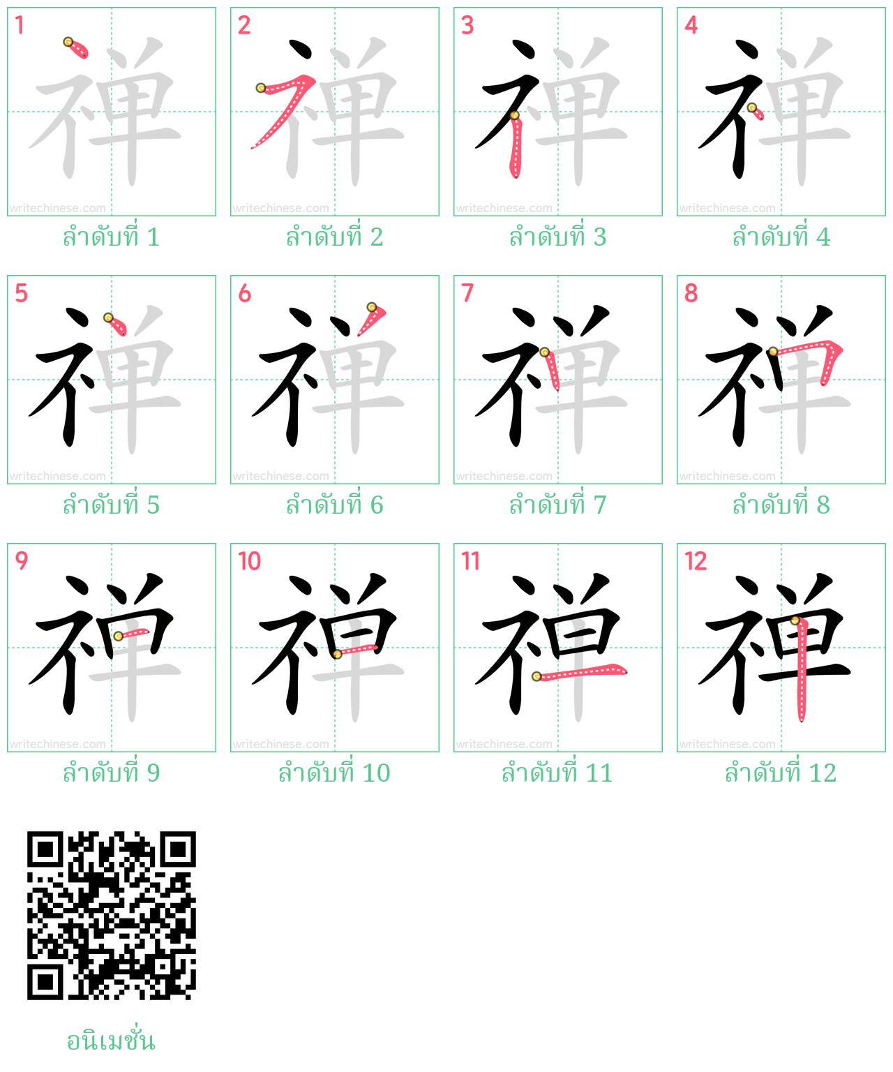 เรียนรู้การเขียนอักษรจีน "禅" โดยการดูภาพเคลื่อนไหวของลำดับการเสียบเส้นของ "禅"