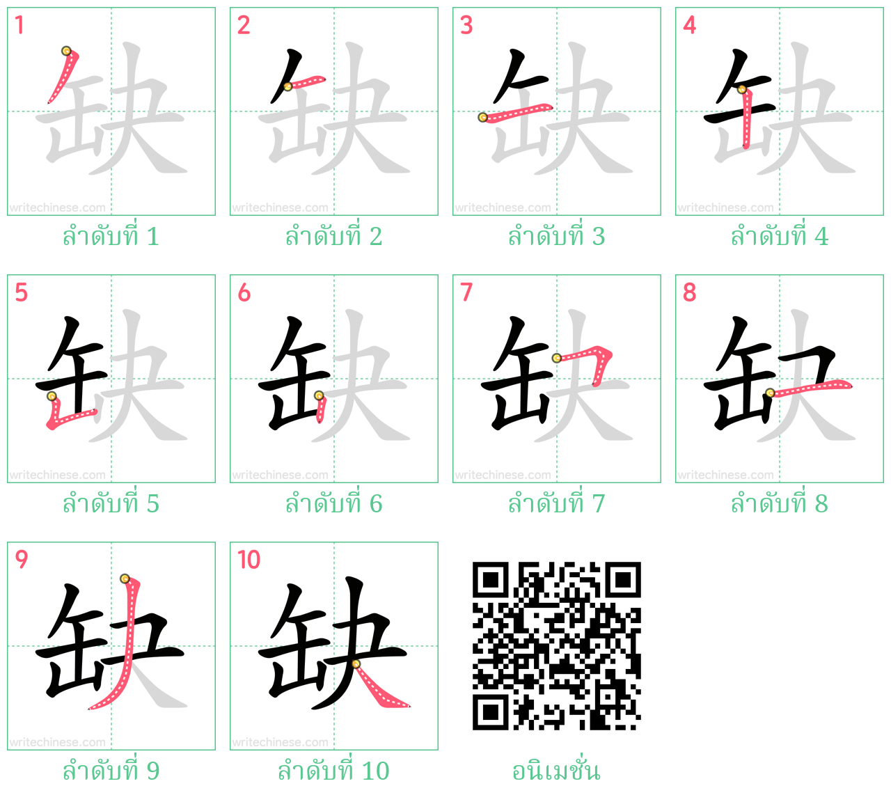 เรียนรู้การเขียนอักษรจีน "缺" โดยการดูภาพเคลื่อนไหวของลำดับการเสียบเส้นของ "缺"