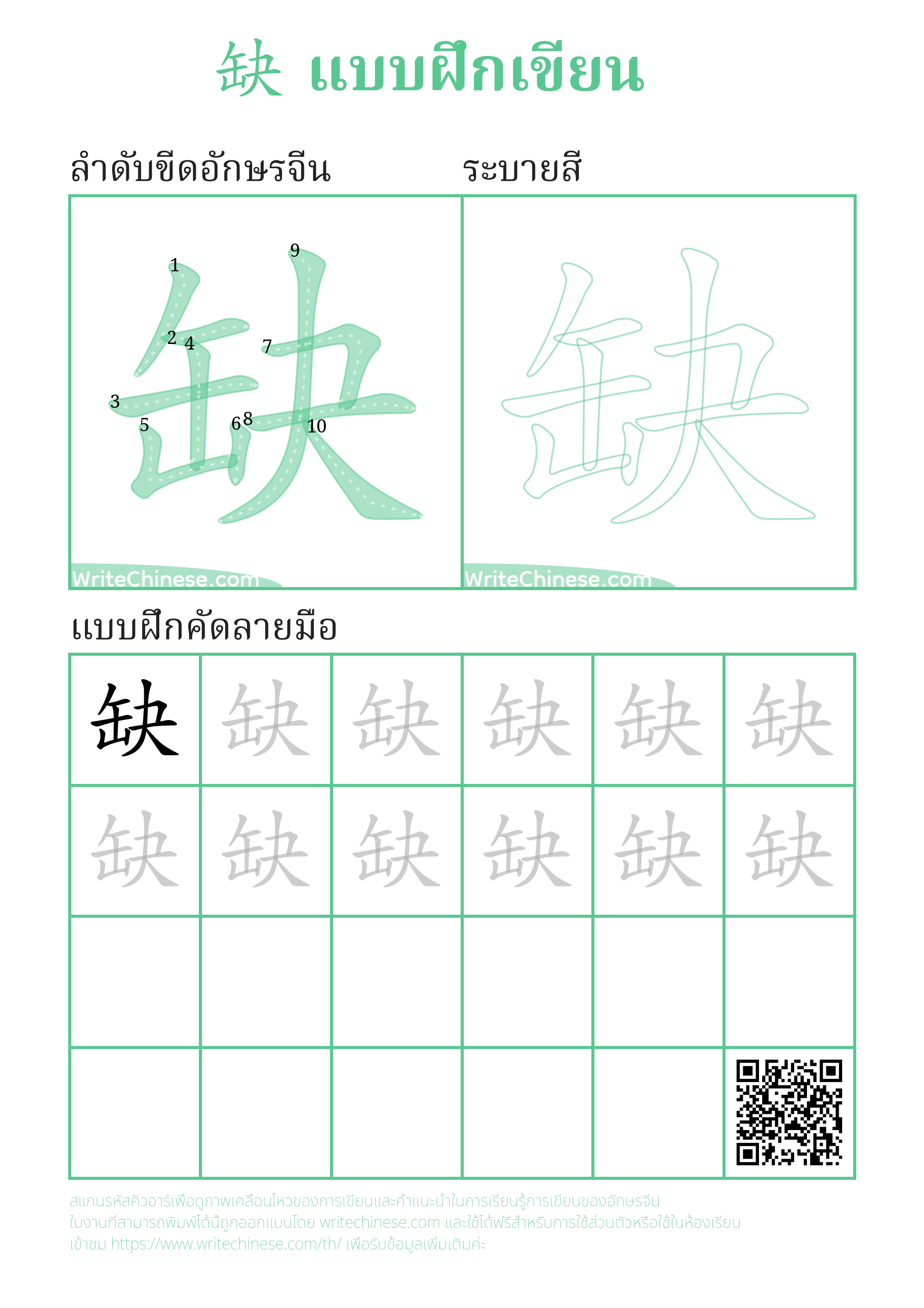 เรียนรู้การเขียนอักษรจีน "缺" ขีดละขีดด้วยคำแนะนำขั้นตอนที่ชัดเจน