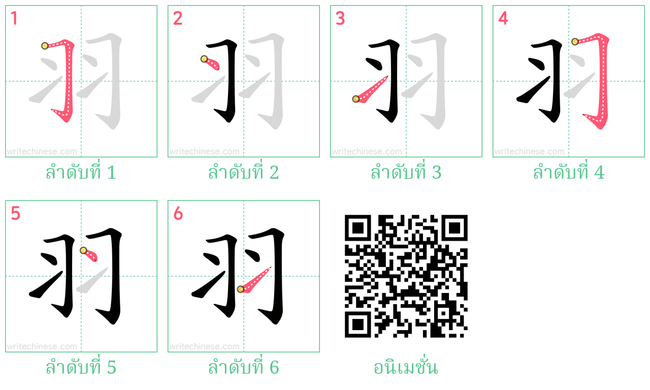 เรียนรู้การเขียนอักษรจีน "羽" โดยการดูภาพเคลื่อนไหวของลำดับการเสียบเส้นของ "羽"