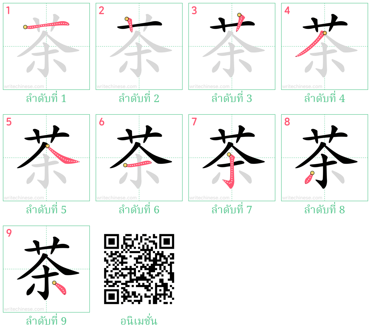 เรียนรู้การเขียนอักษรจีน "茶" โดยการดูภาพเคลื่อนไหวของลำดับการเสียบเส้นของ "茶"