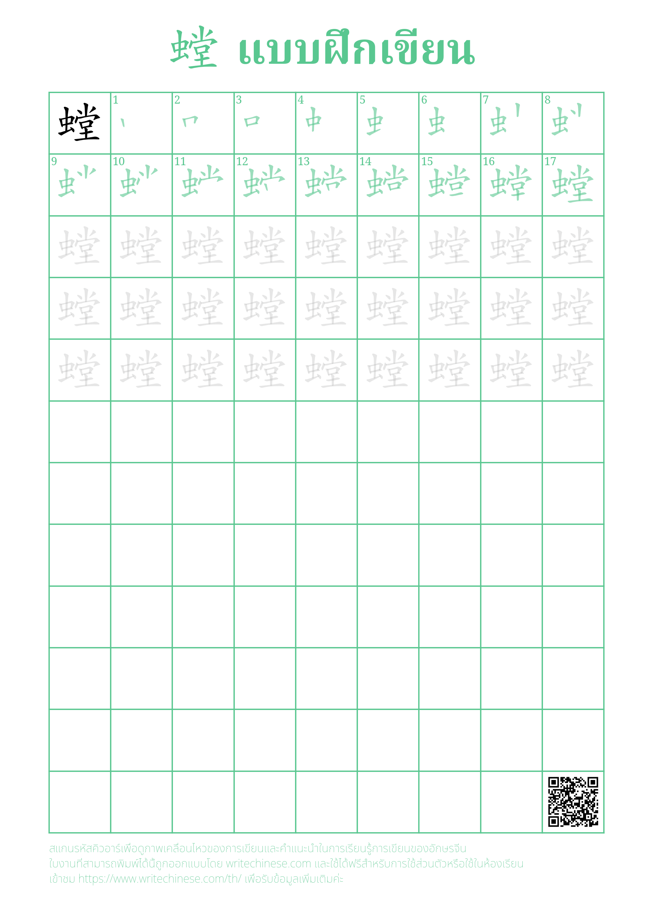 เรียนรู้วิธีเขียนอักษรจีน '螳' ตามคำแนะนำขั้นตอนผ่านวิดีโอสอนจากครูศิลปะเขียนตัวอักษร ตามแนวคำแนะนำขั้นตอนของผู้เชี่ยวชาญในศิลปะเขียนตัวอักษร คุณสามารถดาวน์โหลดแบบฝึกเขียนที่พิมพ์ได้ด้านล่างและฝึกเขียนพร้อมกับปากกาและกระดาษ