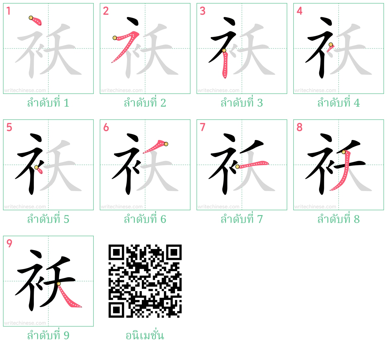 เรียนรู้การเขียนอักษรจีน "袄" โดยการดูภาพเคลื่อนไหวของลำดับการเสียบเส้นของ "袄"
