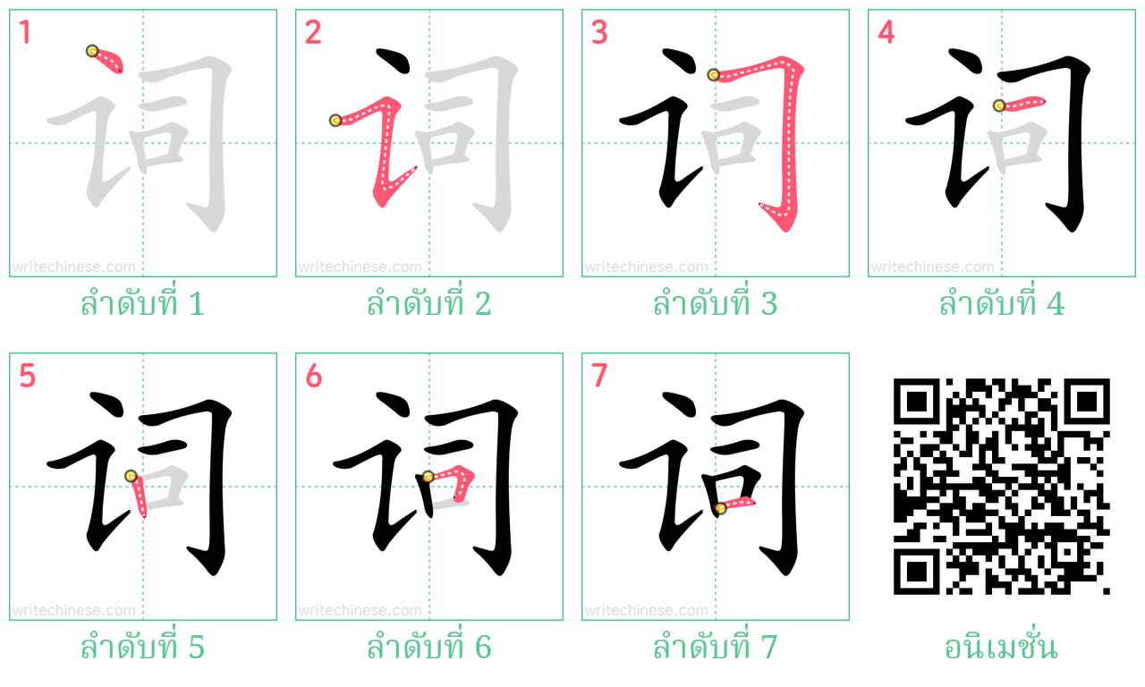 เรียนรู้การเขียนอักษรจีน "词" โดยการดูภาพเคลื่อนไหวของลำดับการเสียบเส้นของ "词"