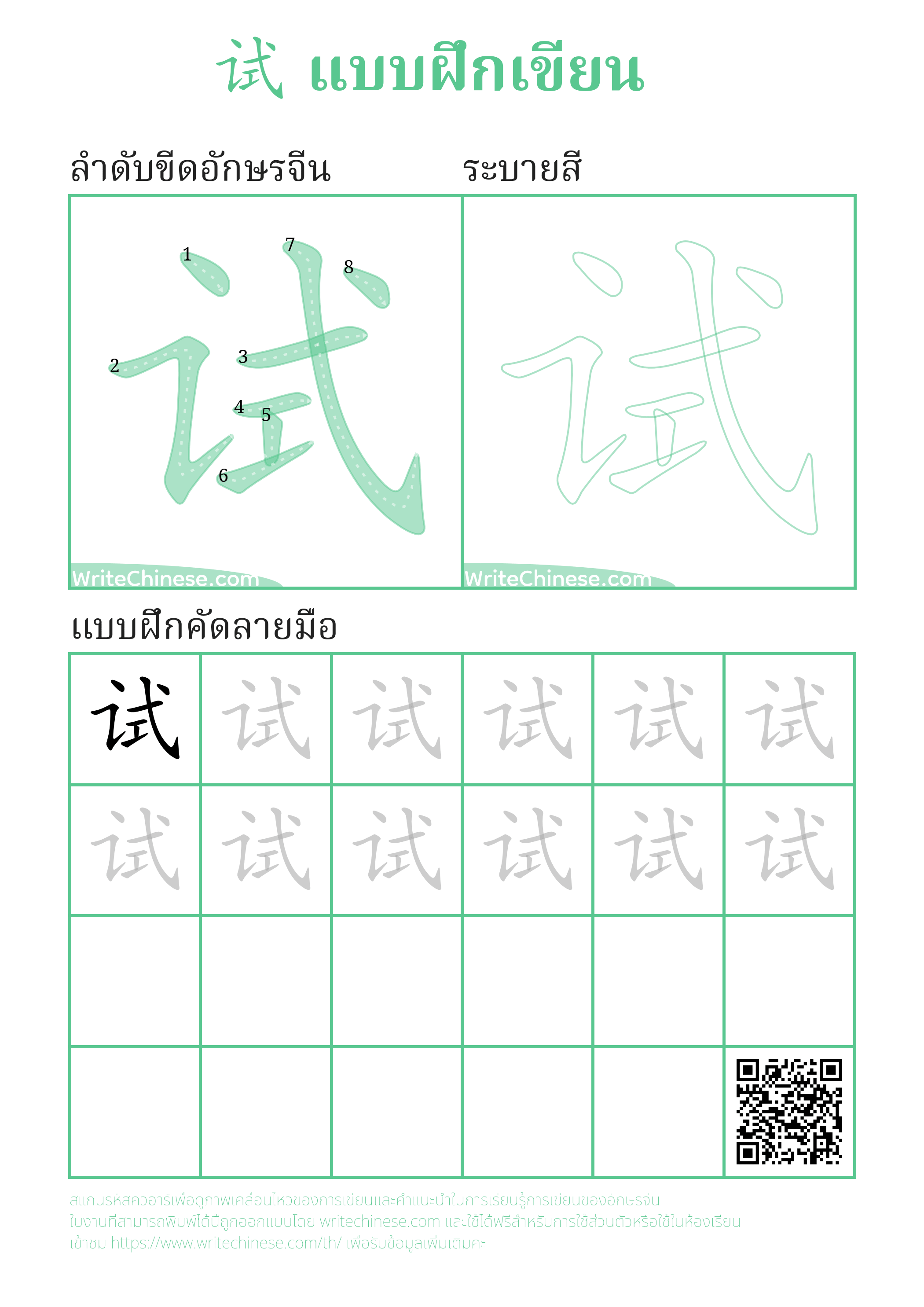 แผ่นงานฝึกฝนลำดับการเขียนตัวอักษรจีน 试 ที่สามารถพิมพ์ได้